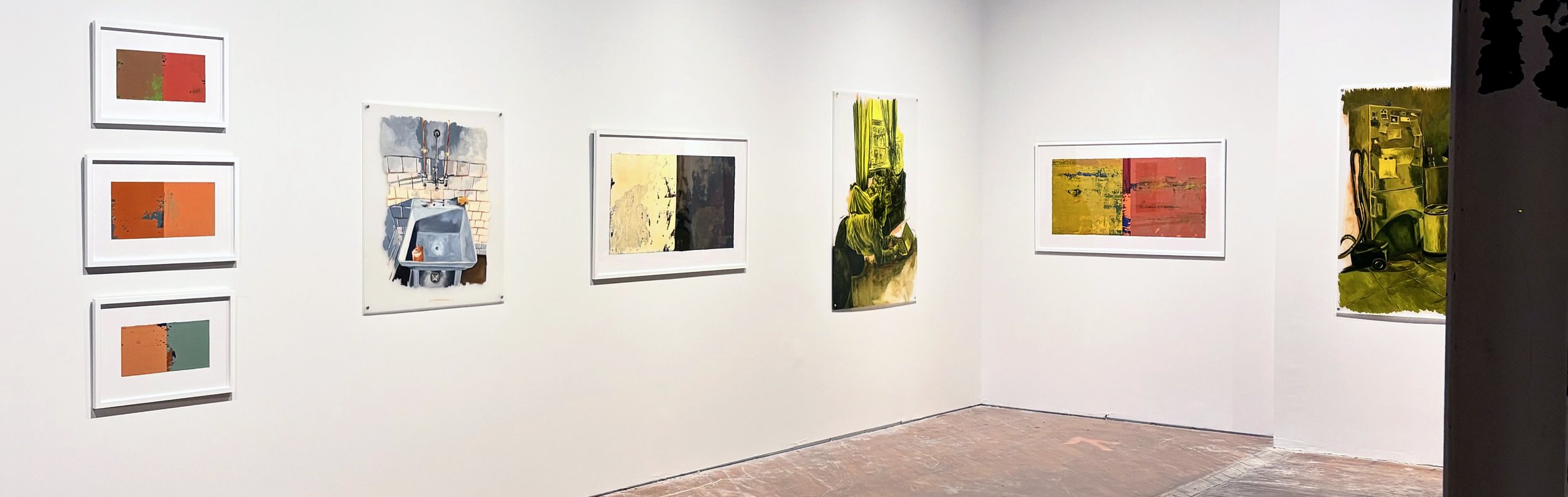 Quynh Vu’s representational paintings employ unusual perspectives and details, taking advantage of the wide viewing angles typical of many cell-phone images. Vu’s works emerge in part from our surfeit online image-culture, and share social media’s impulse to make public the personal and the domestic. There is a punkish vibe to the works, and a typical painting might pair an assertive, dominant green with a balance of blued-gray or flashes of crimson. In these often exaggerated or selective views, color is applied not with concern for conventional description, but expressively, resulting in moody, often noir-ish paintings. And like film stills, they could have been lifted from a paused movie narrative.
